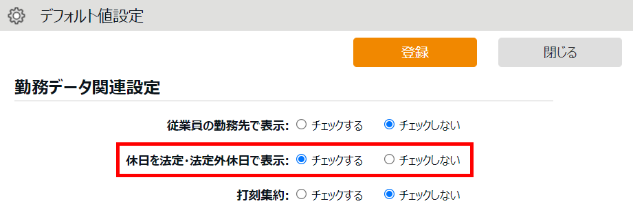 2. 勤務データ関連設定カテゴリ > 休日を法定・法定外休日で表示 にチェックして登録します。