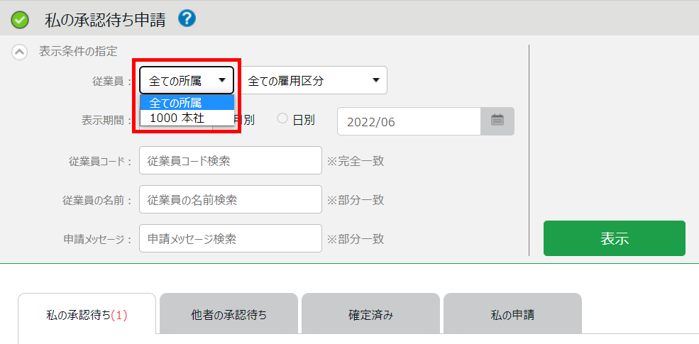 基本申請承認フロー設定に設定された管理者が、削除された所属の申請をチェックする場合は、全メニュー > 申請承認 にて「全ての所属」を選択して表示してください。