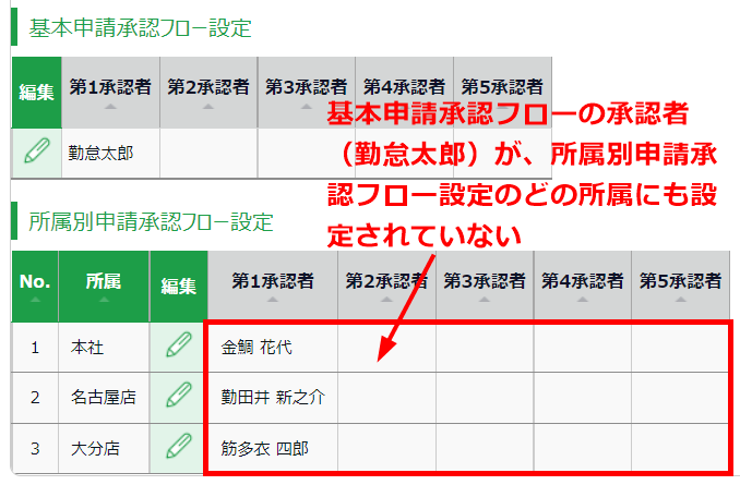 なお、基本申請承認フロー設定に設定された管理者が、所属別申請承認フロー設定にて、どの所属の承認フローにも設定されていない場合、